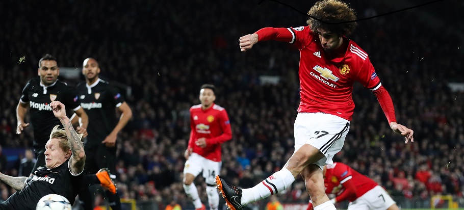 Manchester United's Marouane Fellaini shoots during the UEFA Champions League round of 16, second leg match between Manchester United and Sevilla at Old Trafford, Manchester. On March 13th, 2018. Photo: Martin Rickett / PA Images / Icon Sport